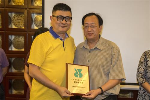 廣州市文化廣電新聞出版局廣播影視處處長徐勸玉向銀都機構廣州公司總經理刁麗君頒授牌匾
